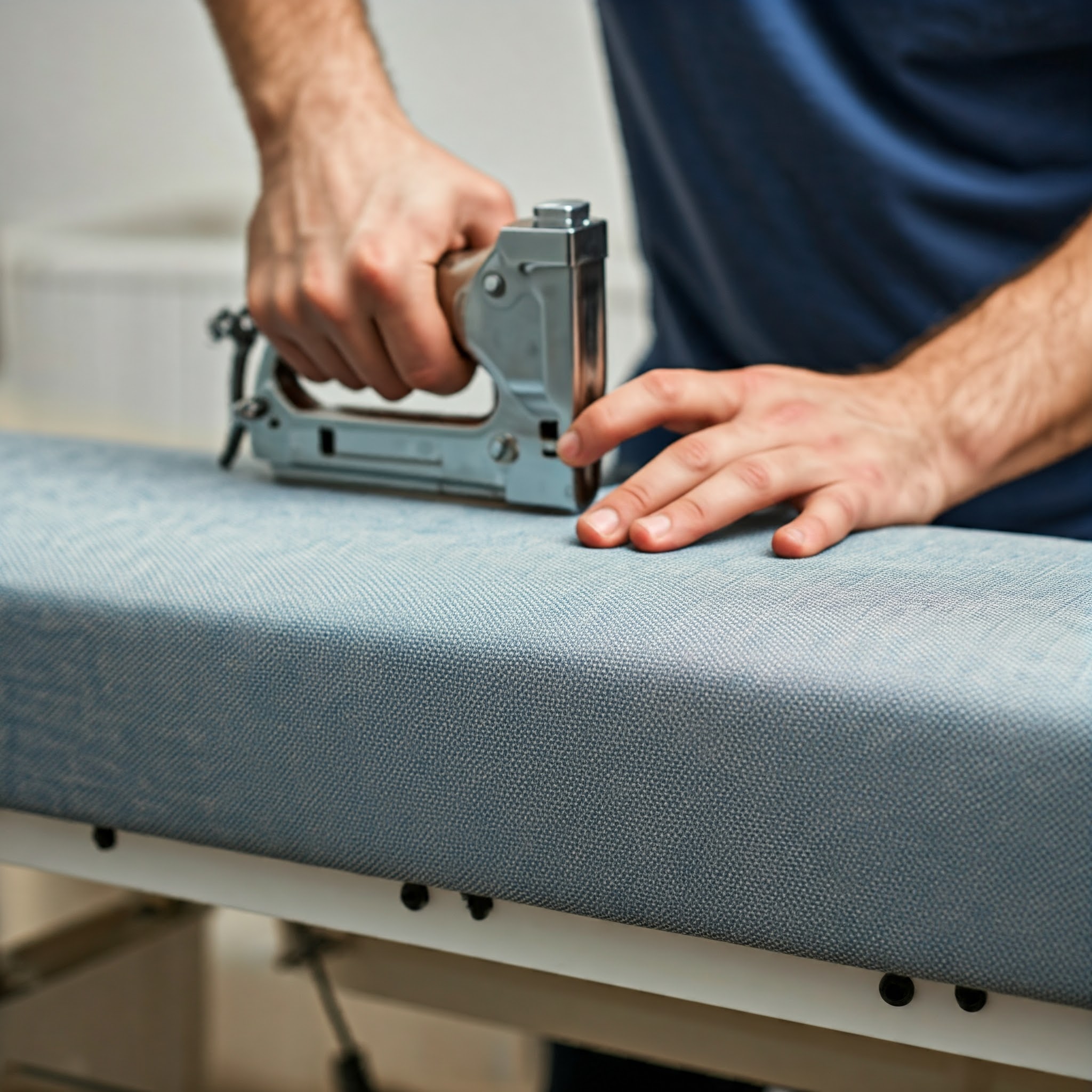 Después, aplicamos una capa de espuma de alta densidad para proporcionar el soporte y la comodidad necesarios durante los masajes. Posteriormente, comenzamos a colocar el nuevo material elegido, asegurándonos de que quede tenso y sin arrugas. Utilizamos técnicas de tapizado de camillas de masaje especializadas para lograr un acabado impecable.